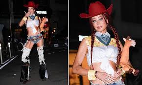 Representing skincare brand Garnier, Attwood channelled Jessie’s spirited energy in a daring costume that featured tiny denim hot pants paired with a large brown buckled belt and a white-and-yellow cropped knot-tie shirt. She completed the look with thigh-high cow-print fringed boot covers, brown studded heeled boots, a dark blue bandana, a red cowboy hat, and a plush toy of Jessie’s horse, Bullseye tucked under her arm.